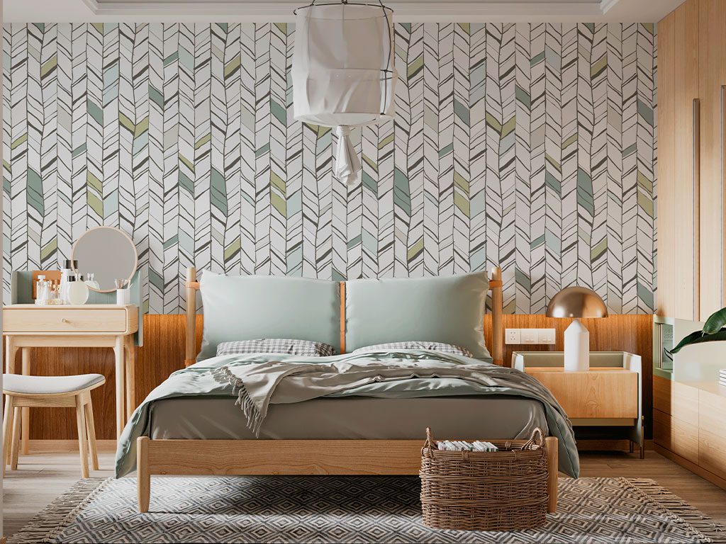 "Cheerful Stripes" presenta un diseño dinámico y alegre con líneas en zigzag que se asemejan a plumas estilizadas en tonos suaves de verde, azul y beige las líneas negras que delimitan las formas añaden un contraste sutil y moderno el patrón repetitivo crea una sensación de movimiento y vitalidad