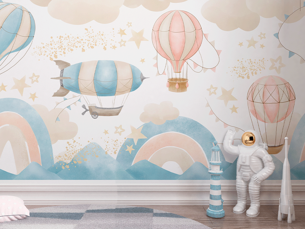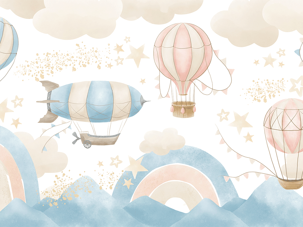 "Dreamy Rainbow" presenta globos aerostáticos en tonos celeste y café pastel, decorados con suaves patrones de rayas y cuadros. El fondo es un cielo azul claro con nubes esponjosas, creando una atmósfera tranquila y soñadora. Perfecto para habitaciones infantiles, este diseño invita a los niños a soñar y explorar en un ambiente relajante y acogedor.