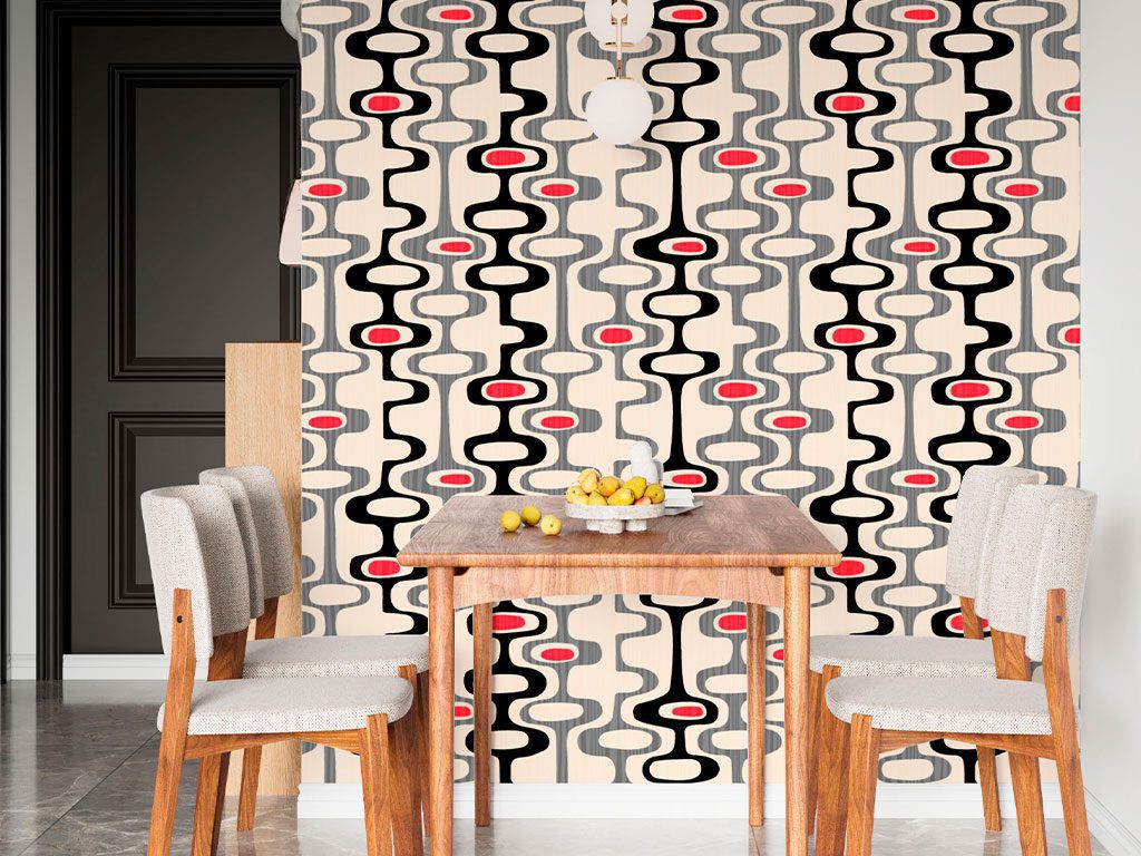 "Exotic Stripes" presenta un diseño audaz y dinámico con formas onduladas en negro, gris y blanco acentuadas con toques de rojo las formas orgánicas y fluidas crean un patrón repetitivo que añade movimiento y energía visual al diseño el contraste entre los colores neutros y los acentos rojos aporta un toque de exotismo y modernidad