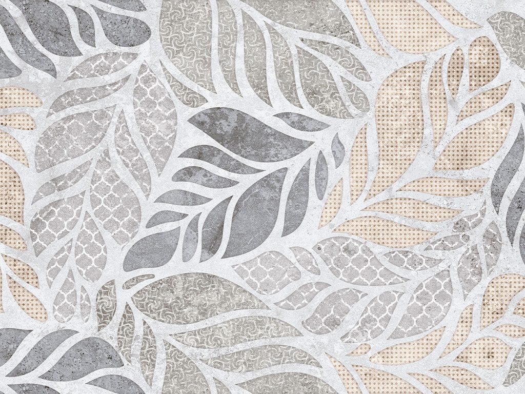 "Leaves Tracks III" presenta un patrón de hojas en tonos neutros como gris, beige y blanco, con texturas variadas y detalles geométricos. Es ideal para salones y salas de estar, dormitorios, oficinas, pasillos y recibidores, restaurantes y cafeterías, así como boutiques y tiendas, añadiendo elegancia y modernidad, creando atmósferas relajantes y profesionales, embelleciendo espacios de tránsito y atrayendo clientes con su apariencia chic y acogedora. Su diseño versátil complementa diversos estilos de decoración