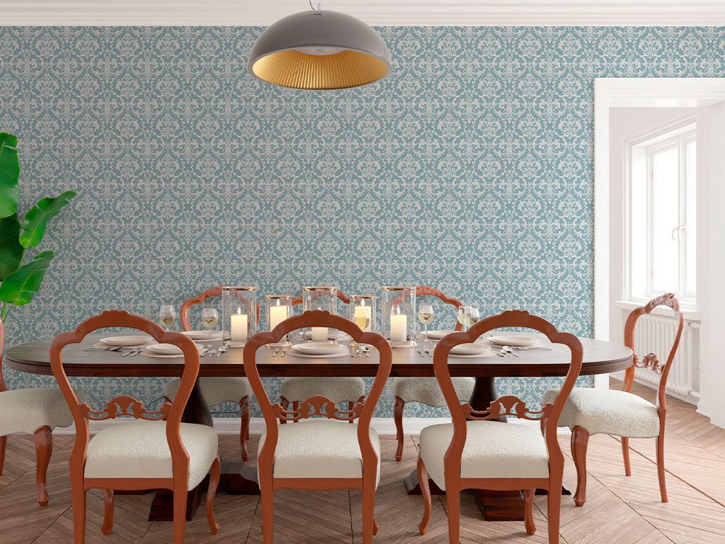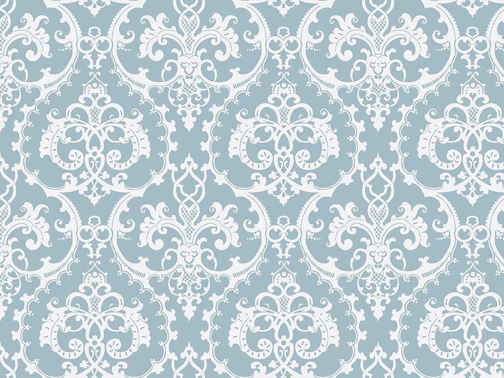 "Light Revolution" exhibe un diseño sofisticado con patrones ornamentales en blanco sobre un fondo azul grisáceo. Los detalles intrincados y el estilo clásico de los motivos aportan una sensación de lujo y refinamiento, creando una atmósfera elegante y atemporal.