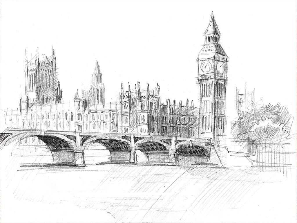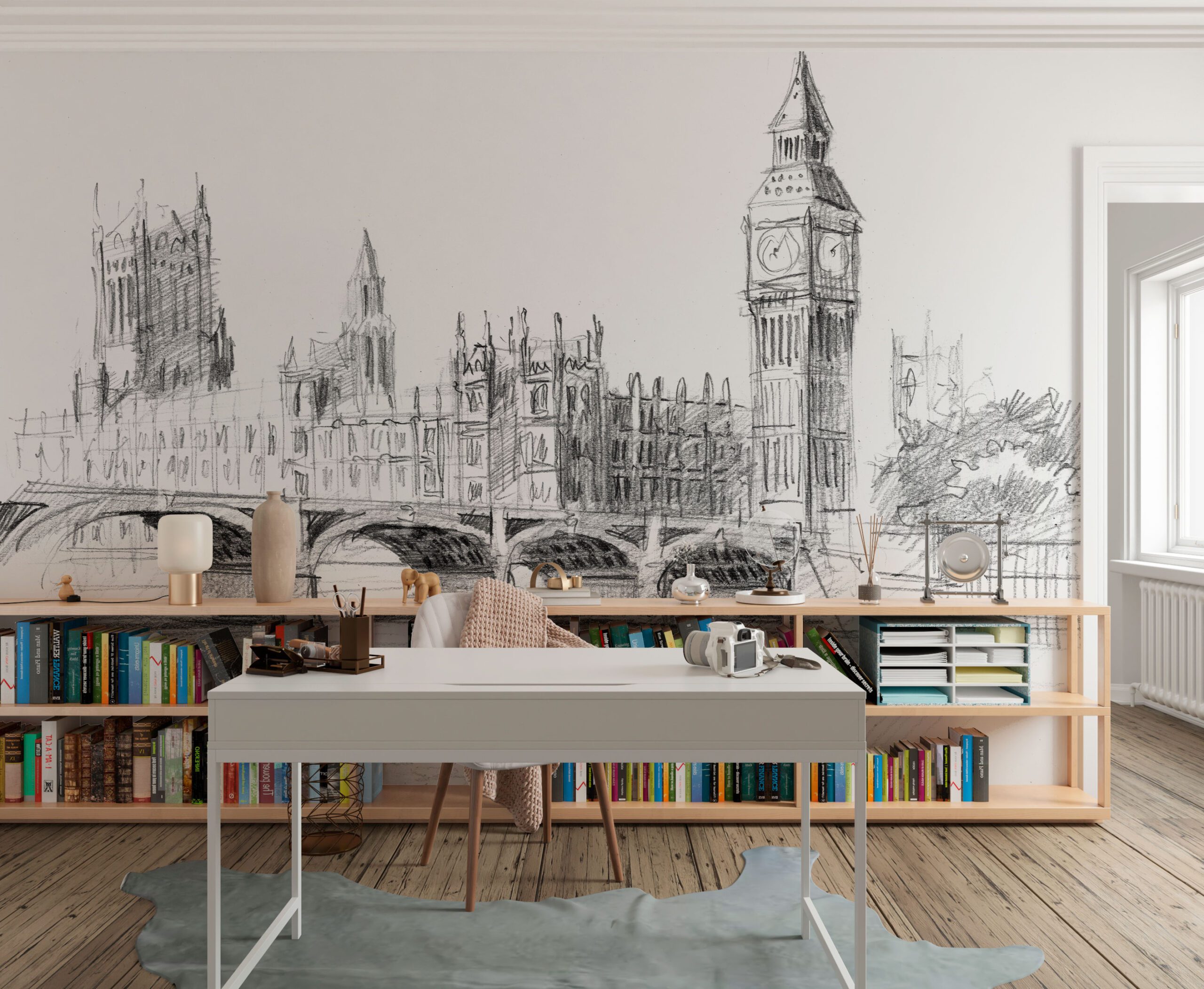 "London Inspiration" presenta un elegante dibujo a lápiz de los icónicos elementos arquitectónicos de Londres destacando el Big Ben y el Palacio de Westminster el trazo delicado y detallado captura la majestuosidad y el carácter histórico de estos monumentos emblemáticos el puente sobre el Támesis añade profundidad y conexión entre los elementos arquitectónicos realzando la perspectiva clásica del paisaje urbano londinense