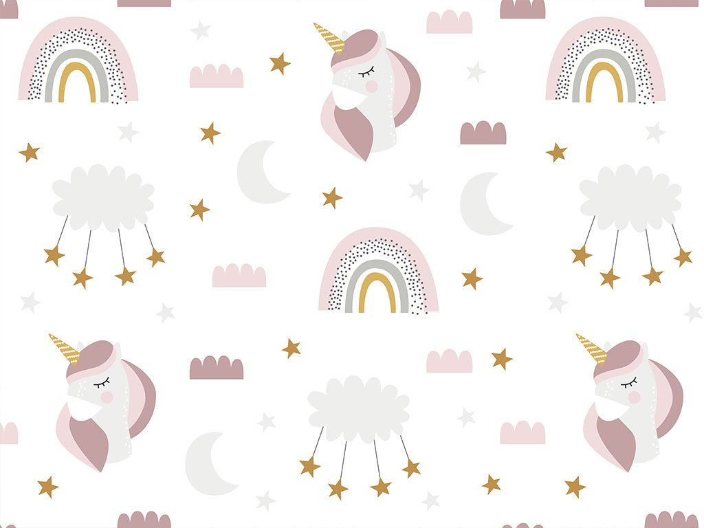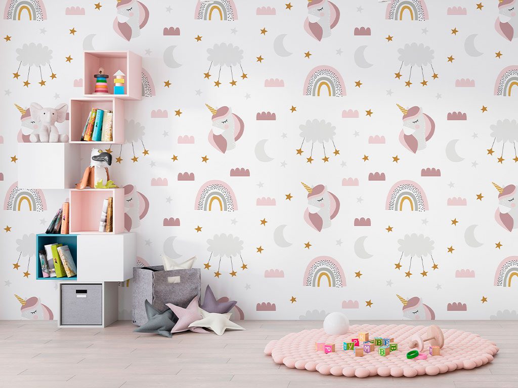 "Love Unicorns" presenta un diseño adorable y mágico con unicornios, arcoíris, nubes y estrellas en tonos pastel de rosa, gris y dorado sobre un fondo blanco. Este diseño es ideal para habitaciones infantiles, guarderías, salas de juegos y zonas de lectura, creando un ambiente encantador y lleno de fantasía. Perfecto para añadir un toque de dulzura y magia, este papel mural complementa una decoración infantil, proporcionando un entorno acogedor y estimulante para los niños.