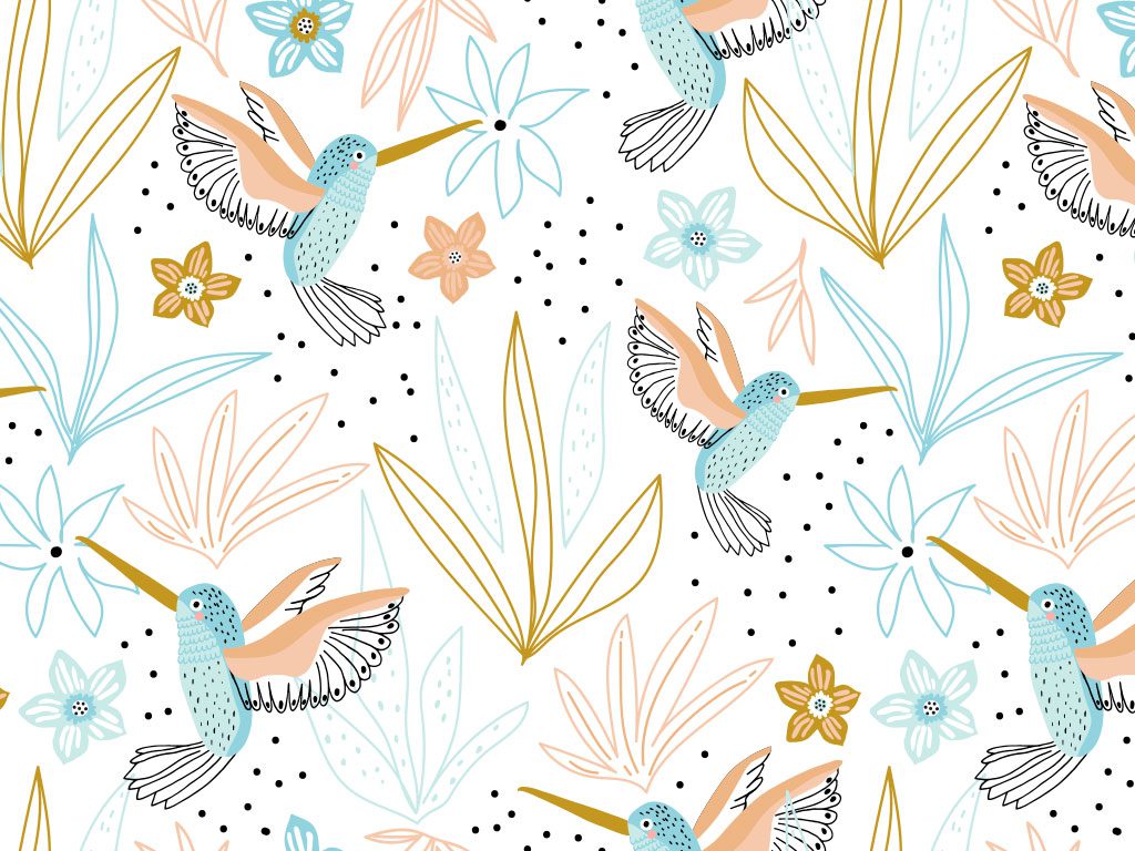 "Magic Hummingbird" presenta un vibrante patrón de colibríes en vuelo y flores en tonos pastel y dorados sobre un fondo blanco. Este diseño encantador y colorido es ideal para habitaciones de niños, salas de juego, jardines infantiles y estudios de arte, aportando un ambiente alegre y animado. Perfecto para cualquier espacio que busque una decoración que inspire belleza y dinamismo, con un toque de naturaleza y magia.