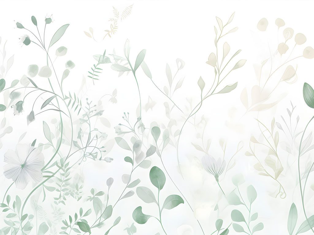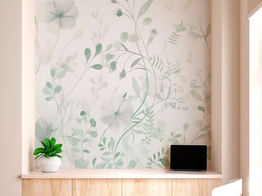 "Minimalistic Leaves" presenta un diseño delicado y etéreo de hojas y flores en tonos verdes y beige sobre un fondo blanco. Este mural es ideal para añadir un toque de serenidad y elegancia a cualquier espacio, incluyendo salas de estar, dormitorios, oficinas, spas y hoteles. La disposición suave y sutil de las hojas crea un patrón visualmente atractivo que complementa tanto decoraciones modernas como clásicas. Es perfecto para destacar una pared, aportando profundidad y una sensación de calma y belleza natural al entorno, creando un ambiente acogedor y armonioso.