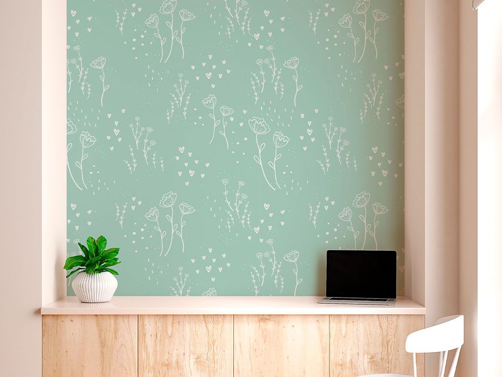 "Mint Meadow" presenta delicadas flores y corazones dibujados en blanco sobre un fondo verde menta suave. Este patrón encantador y fresco es ideal para añadir un toque de alegría y serenidad a cualquier espacio del hogar. Es perfecto para salas de estar, dormitorios, habitaciones infantiles, comedores y oficinas en casa, creando una atmósfera acogedora y relajante. Su versatilidad permite complementar diversos estilos de decoración, desde lo clásico hasta lo moderno, transformando cualquier habitación en un espacio armonioso y encantador.
