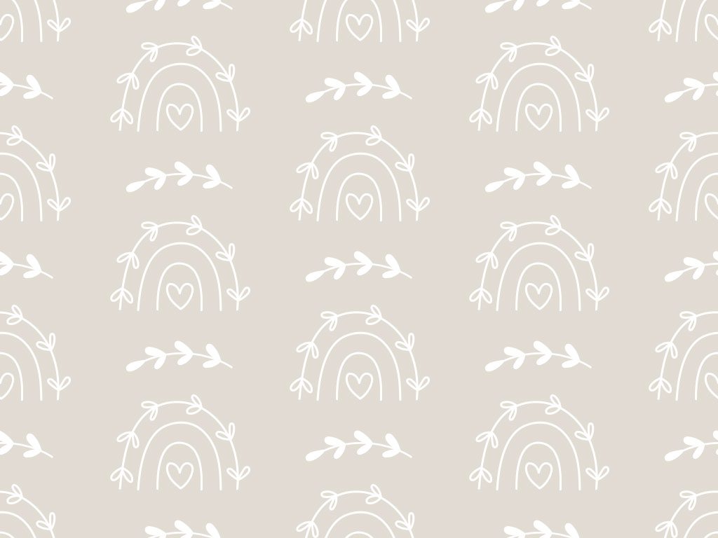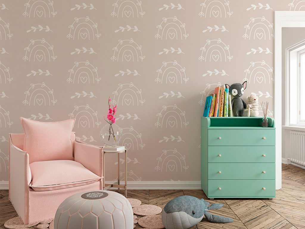 "Neutral Rainbows" presenta un patrón de arcos iris y ramitas en blanco sobre un fondo beige neutro. Este diseño minimalista y elegante es ideal para crear un ambiente calmado y acogedor en habitaciones de bebés y niños pequeños, salas de juego, jardines infantiles, consultorios pediátricos y espacios de lectura. Aporta serenidad y simplicidad, siendo perfecto para cualquier espacio que busque una atmósfera relajante y acogedora.