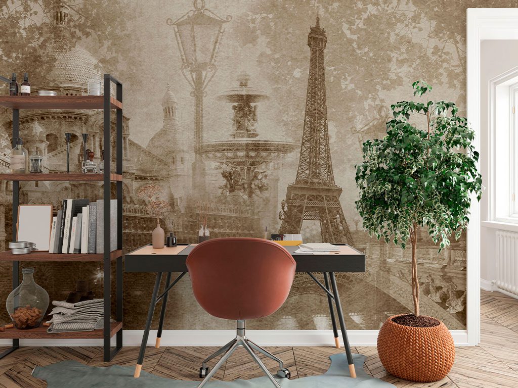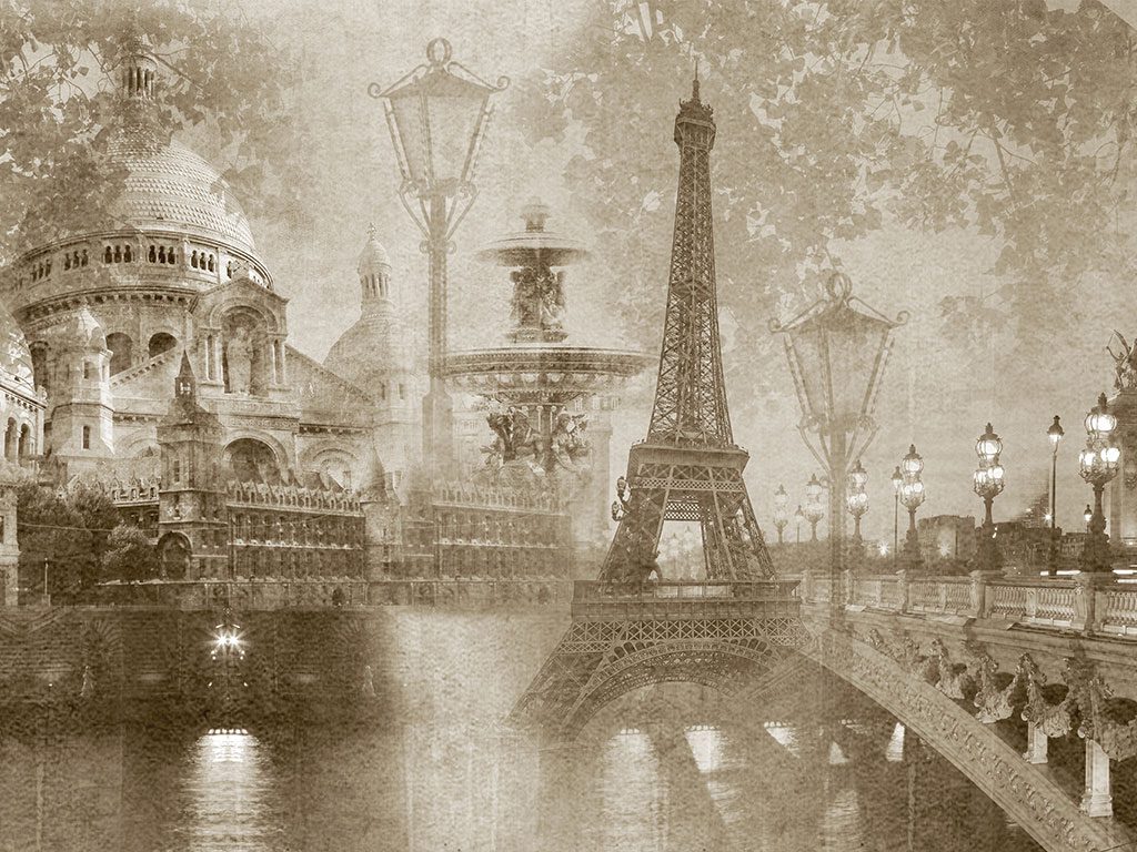 "Night Paris" presenta una elegante composición en tonos sepia que captura la magia nocturna de París con una mezcla de iconos arquitectónicos como la Torre Eiffel y la Basílica del Sacré-Cœur el diseño combina faroles antiguos y puentes parisinos creando una atmósfera nostálgica y romántica las texturas suaves y los detalles arquitectónicos se entrelazan para ofrecer una visión atemporal de la Ciudad de la Luz