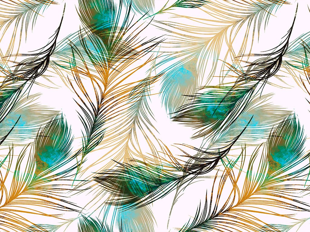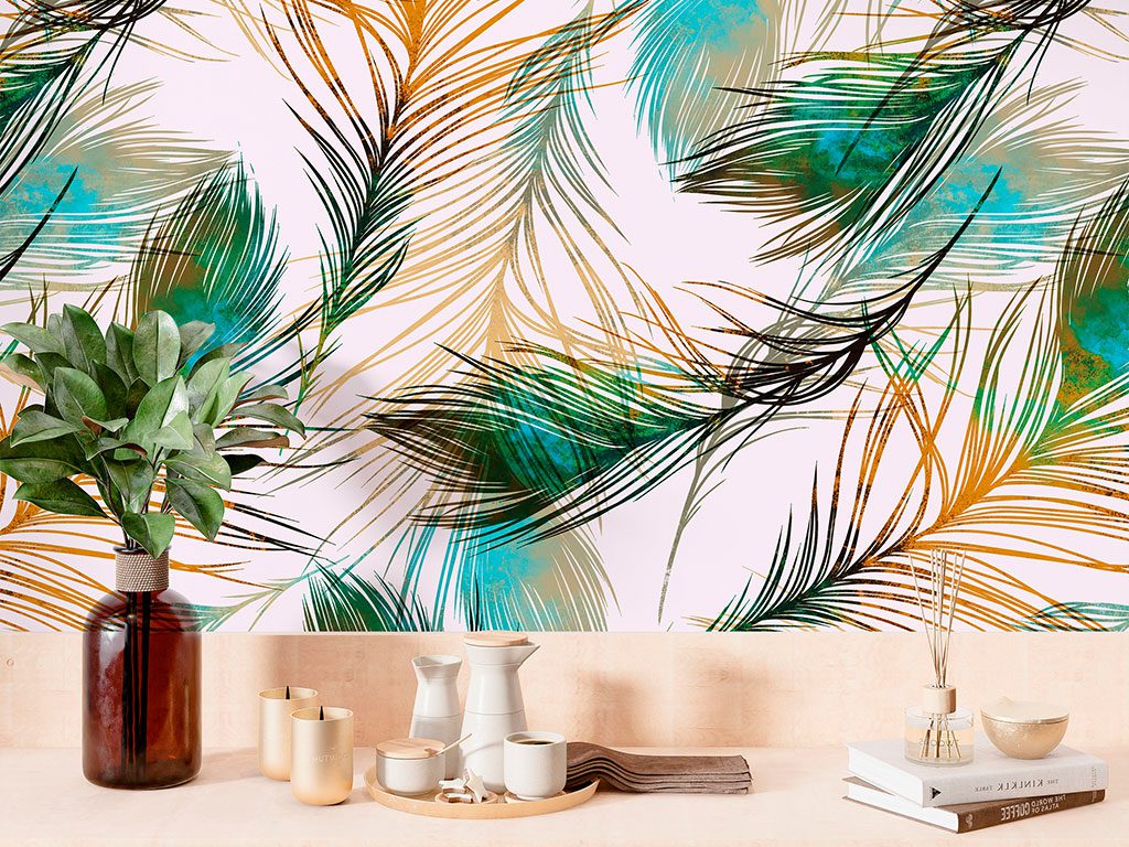 "Peacock Feathers" presenta un diseño vibrante y colorido de plumas de pavo real en tonos verdes, azules y dorados sobre un fondo blanco. Este mural es ideal para añadir un toque de exotismo y elegancia a cualquier espacio, incluyendo salas de estar, dormitorios, oficinas, estudios de arte y cafeterías. La disposición dinámica y los colores brillantes de las plumas crean un patrón visualmente atractivo que puede complementar tanto decoraciones modernas como clásicas. Es perfecto para destacar una pared y transformar el ambiente en un entorno sofisticado y llamativo, aportando un toque de naturaleza estilizada y opulenta al entorno.