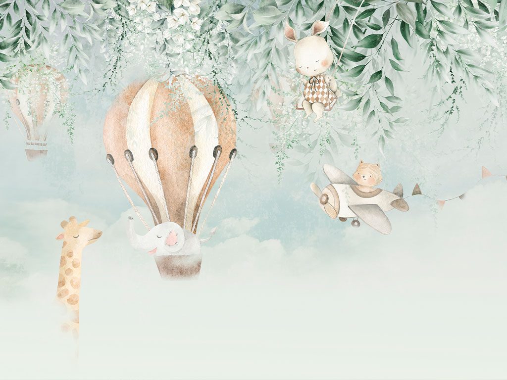 "Romantic Bear Pilot" presenta un encantador diseño infantil con un tema de aventuras aéreas, incluyendo un osito piloto en un avión, un elefante en un globo aerostático, y una jirafa asomándose entre las nubes, todo en tonos suaves y pasteles. Ideal para habitaciones infantiles, guarderías, salas de juegos y zonas de lectura, este papel mural crea un ambiente mágico y acogedor que estimula la imaginación y brinda un toque de fantasía a cualquier espacio dedicado a los niños.